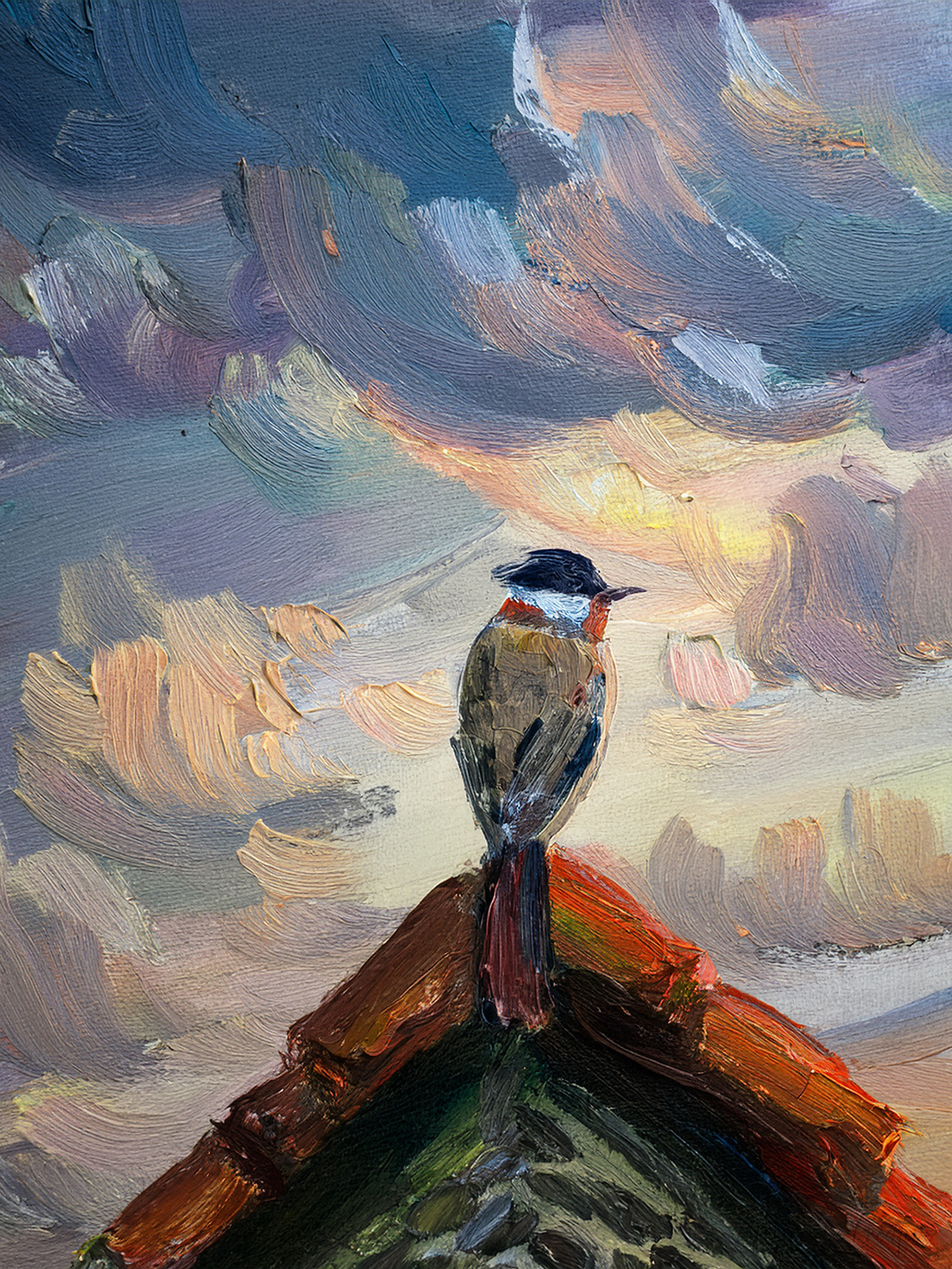 "Single Bird" features one bird looking out over a wide, colorful sky. It brings a feeling of hope, watching the world, and calm.