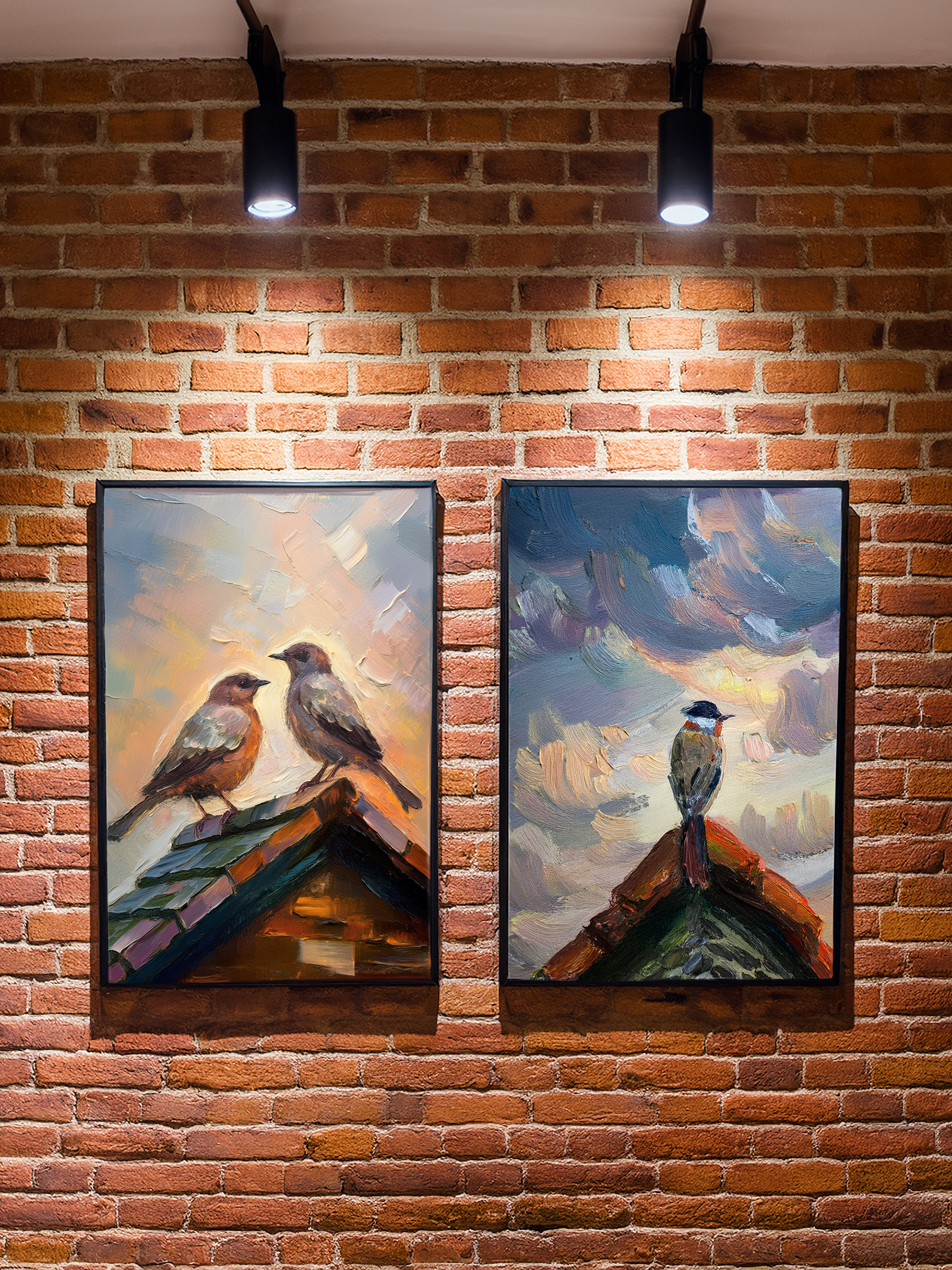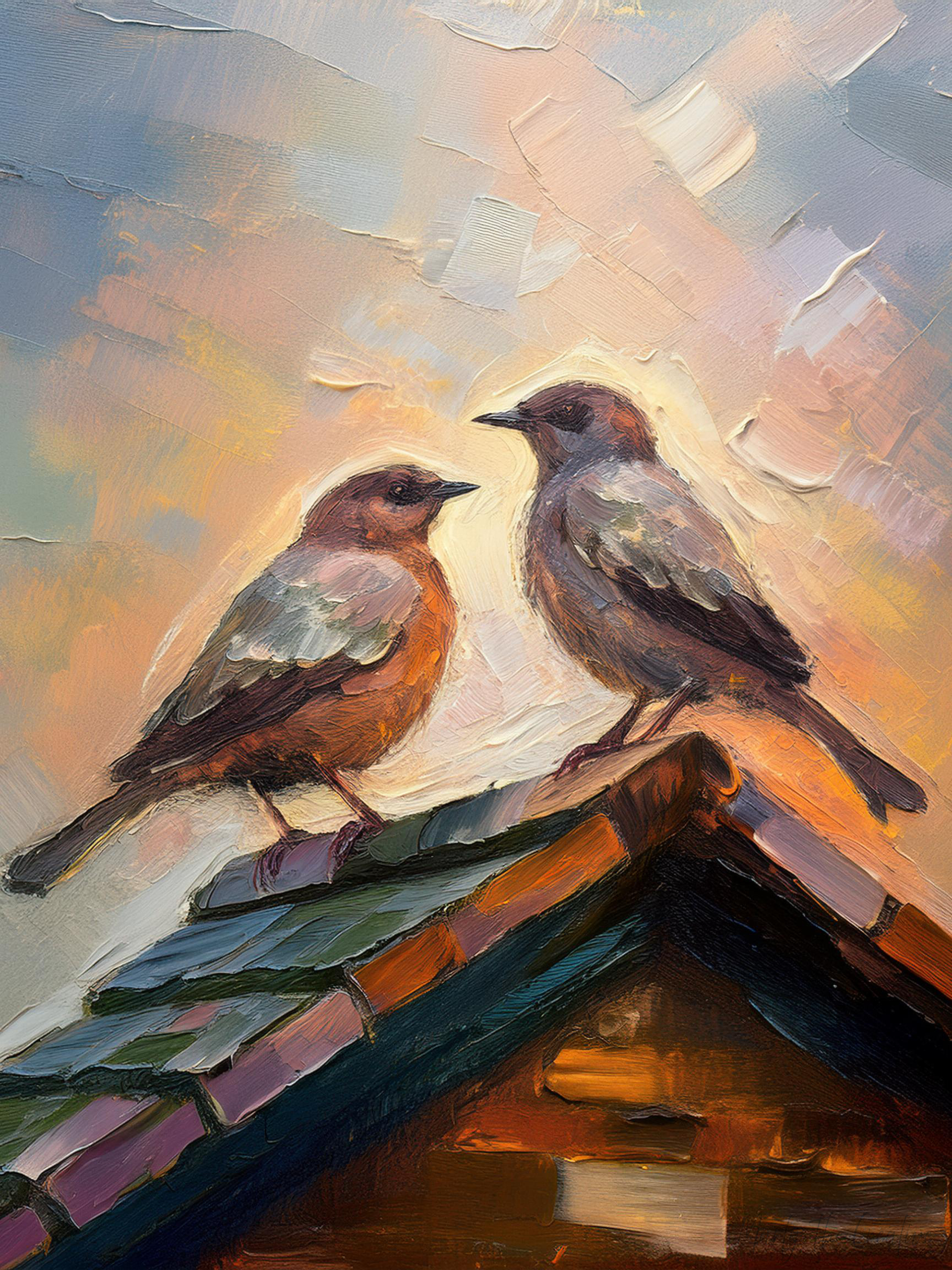 "Two Birds" shows a gentle, connected moment. Two birds sit close, sharing the soft light of dawn or dusk. It's about companionship and quiet peace.