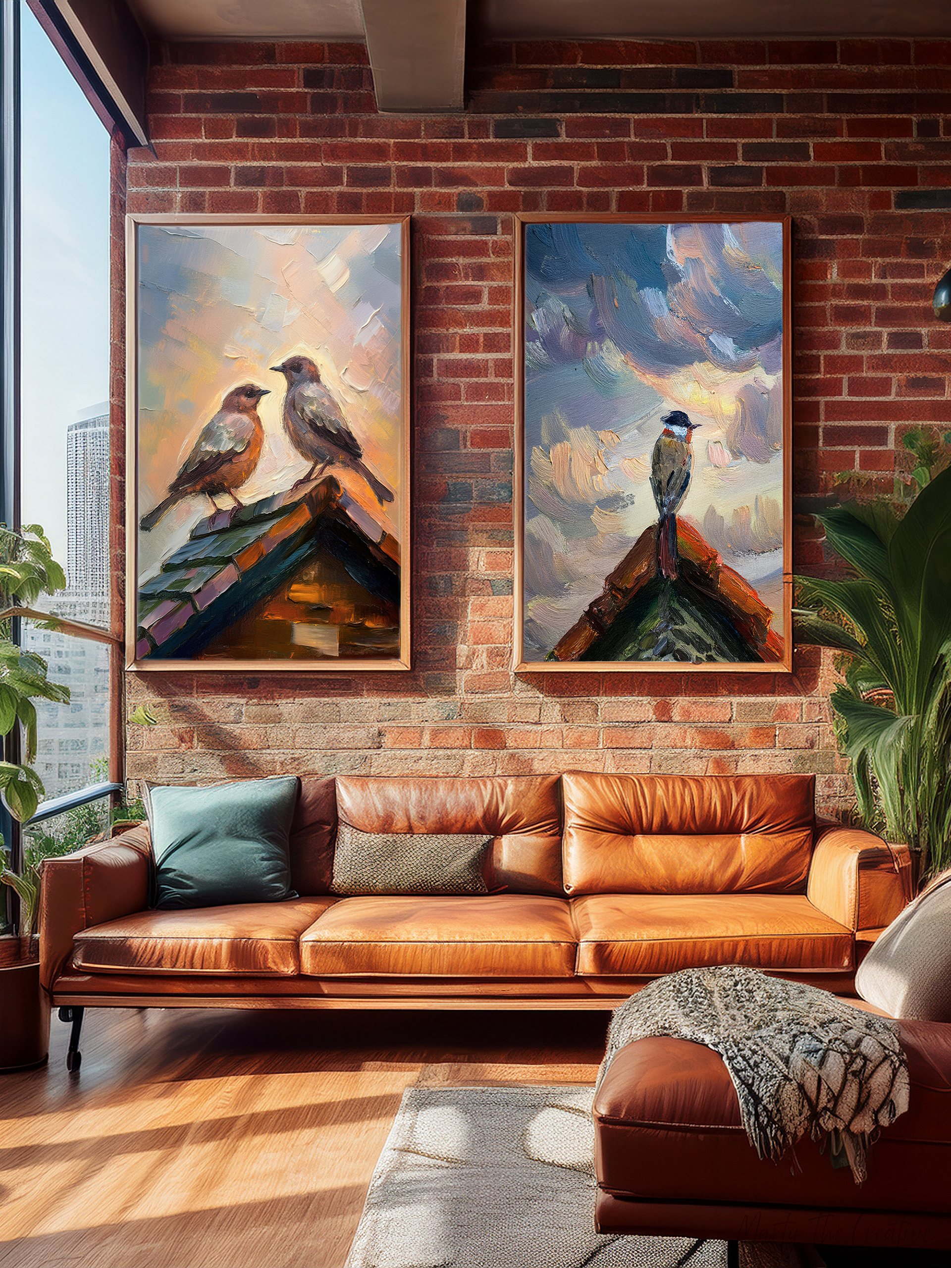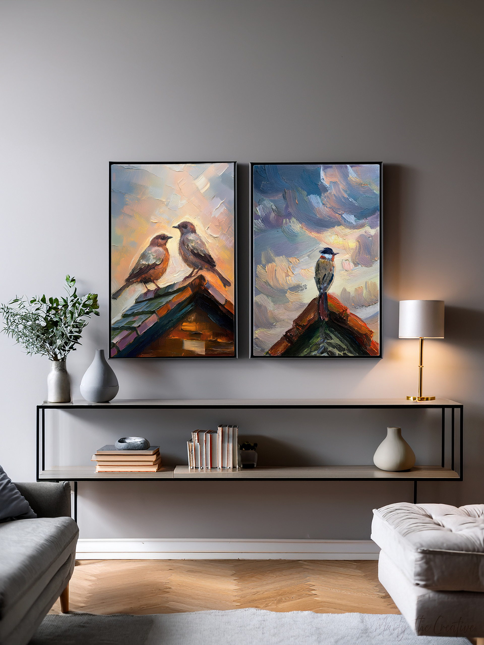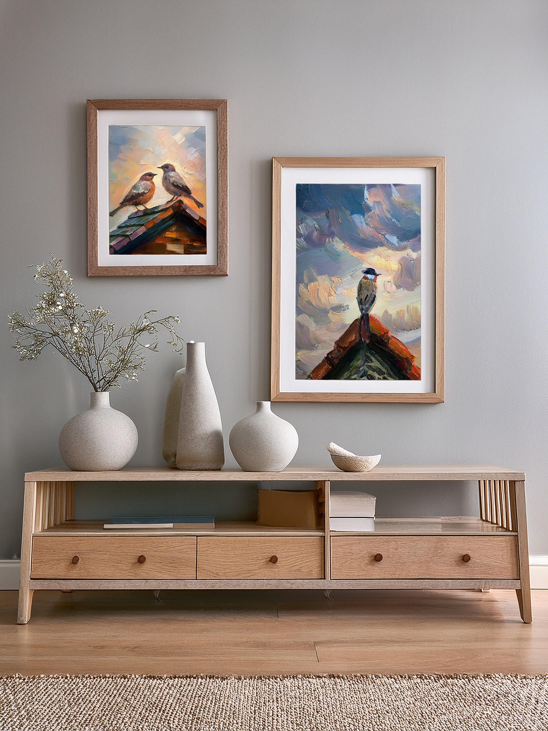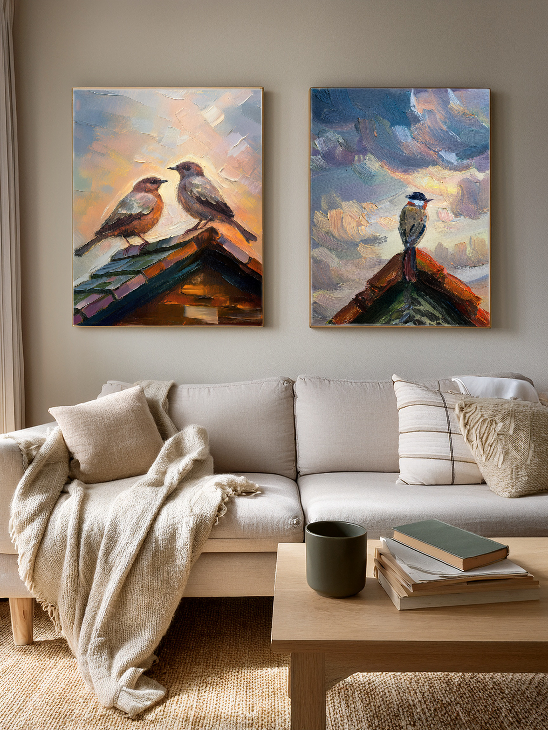 Two charming bird paintings that capture moments of quiet connection and hopeful watching. Perfect for bringing peace and warmth into your home.