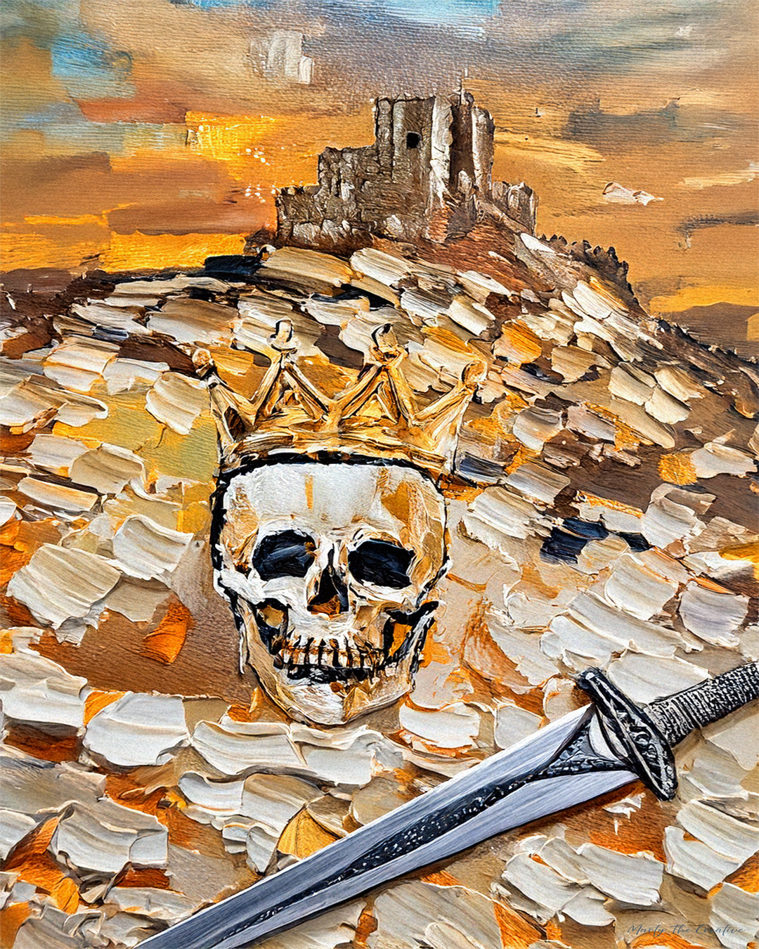 This painting, "Claimed," is a statement of true independence. It shows a crown on a skull, with a sword and a distant castle. These symbols represent power, expectation, and the world's rules.