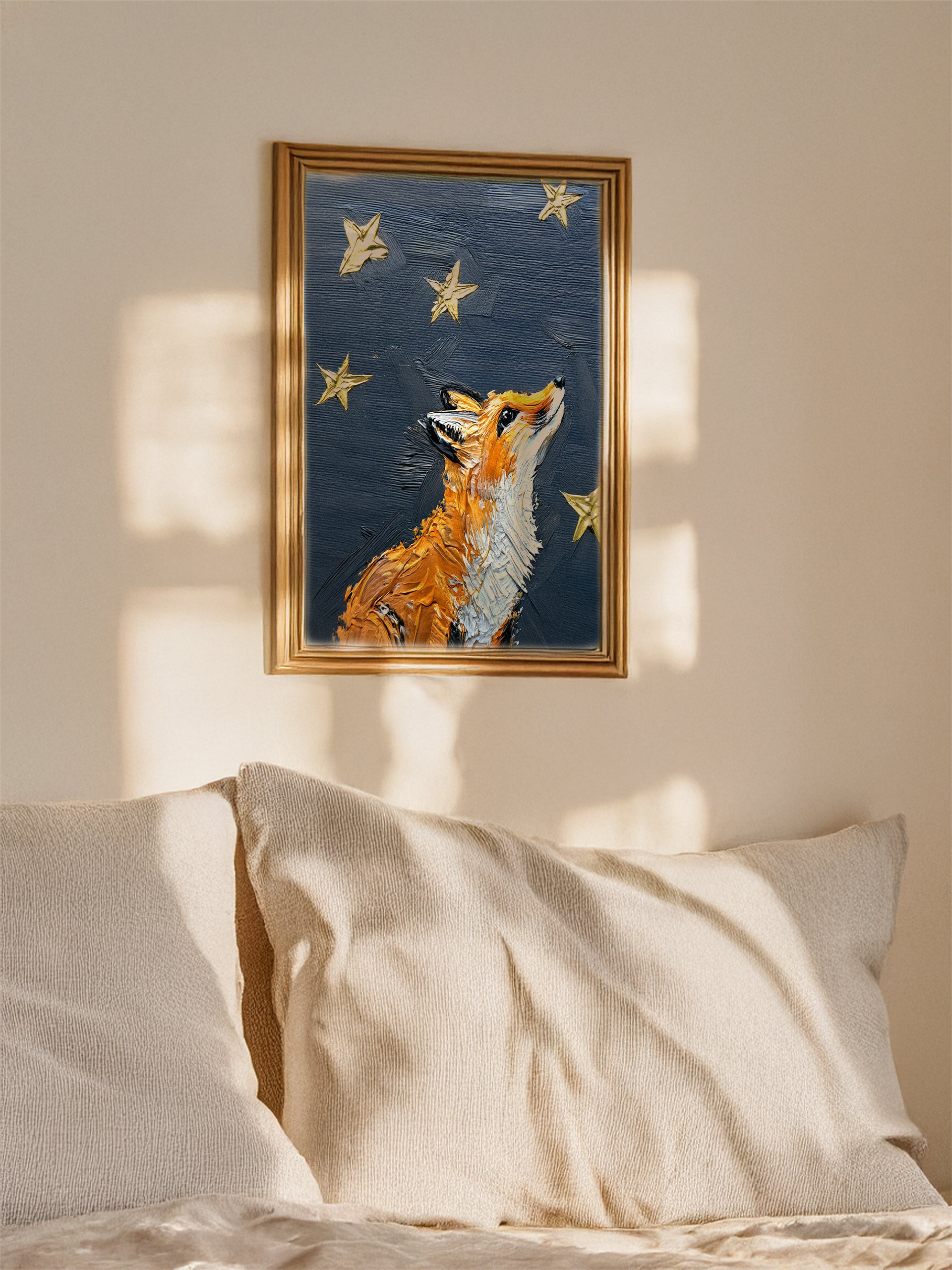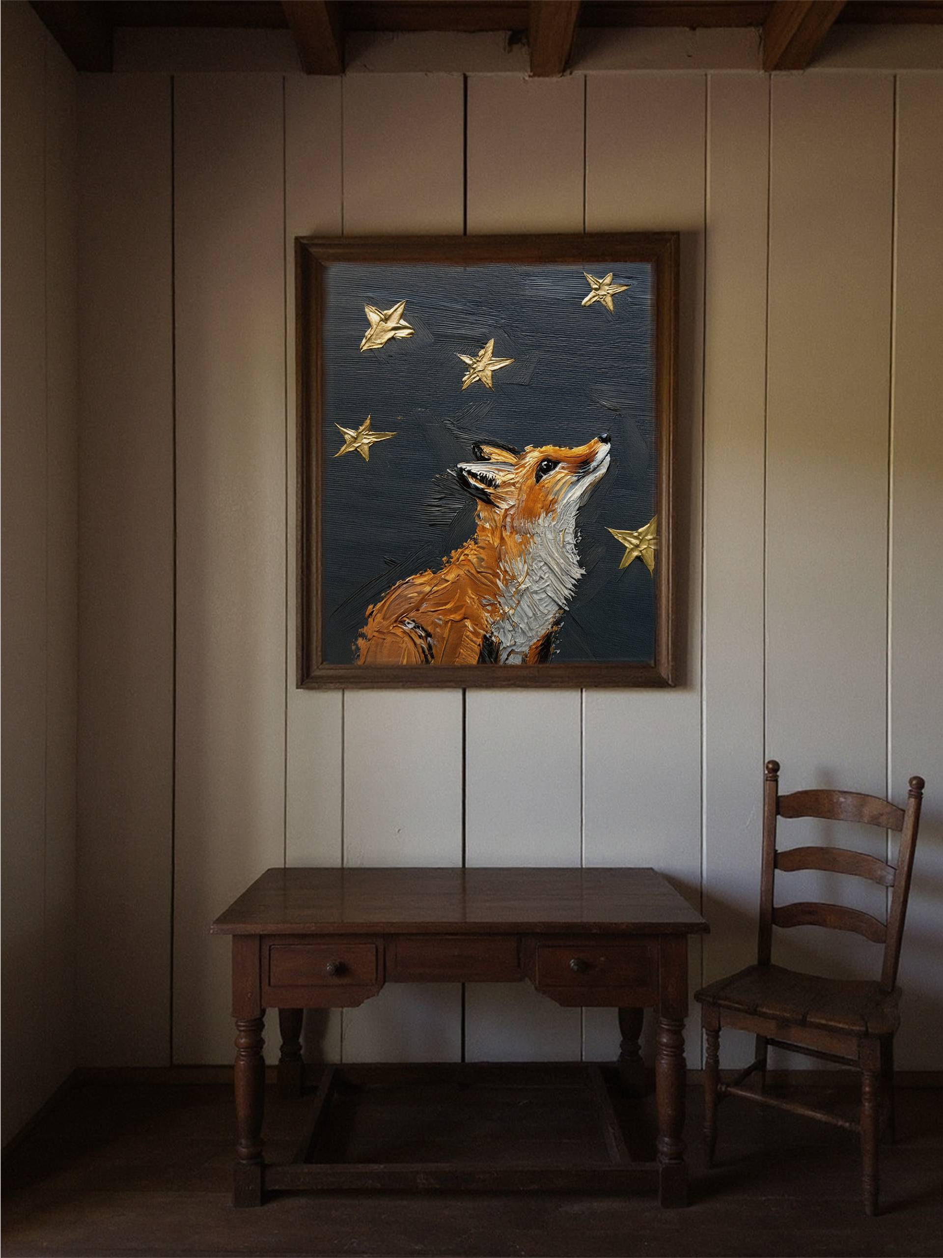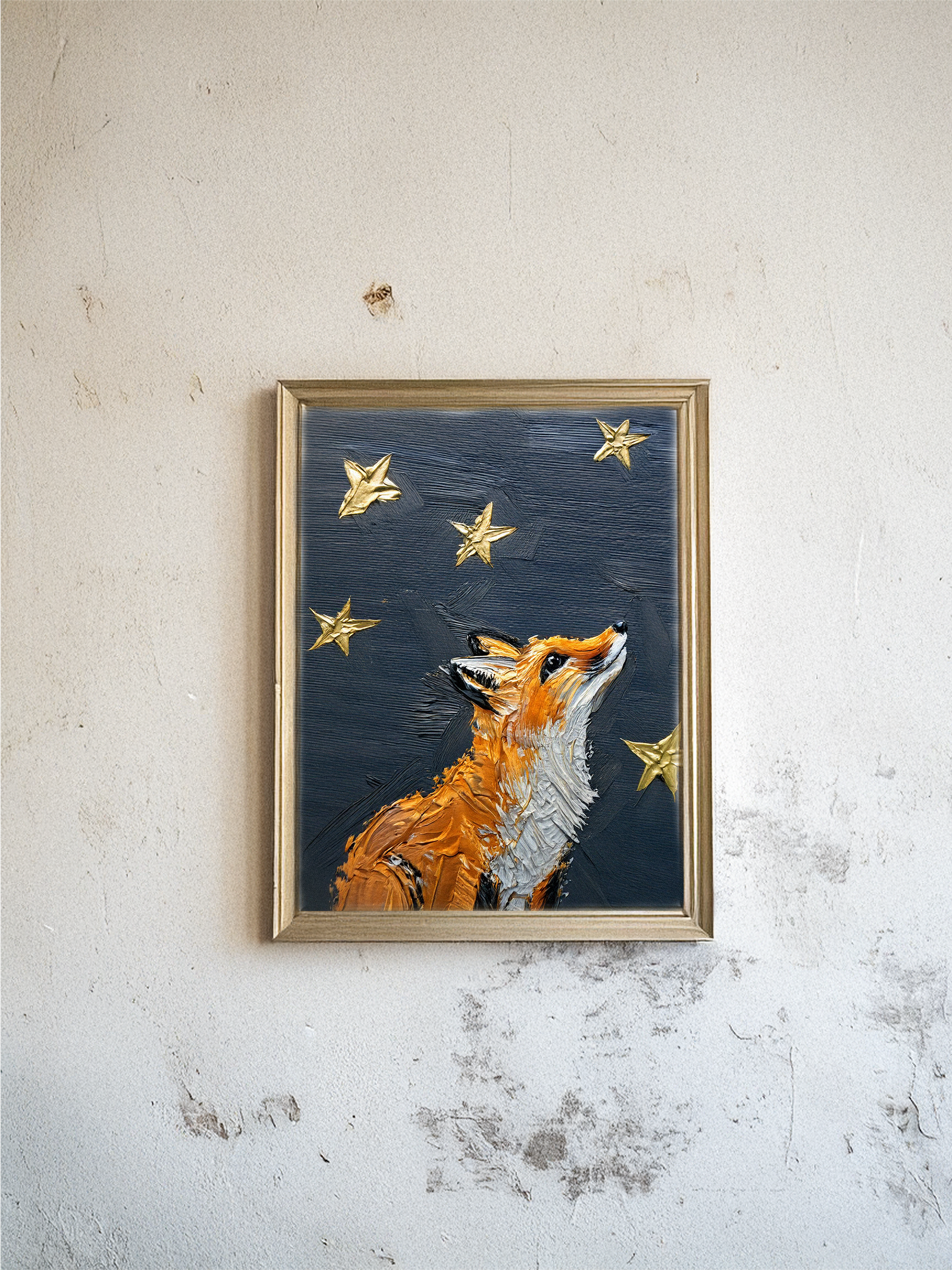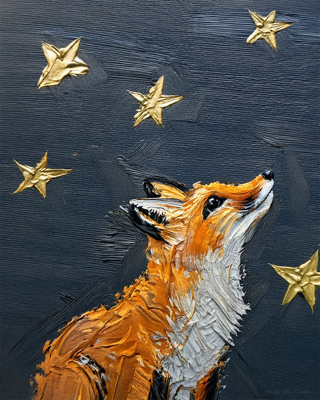 This piece is about wonder, hope, and finding your way. I painted this fox looking up at the night sky, with the North Star and other gold accents twinkling above. The rough, textured paint on the fox shows its wilderness, while its gaze upward is soft and full of meaning.