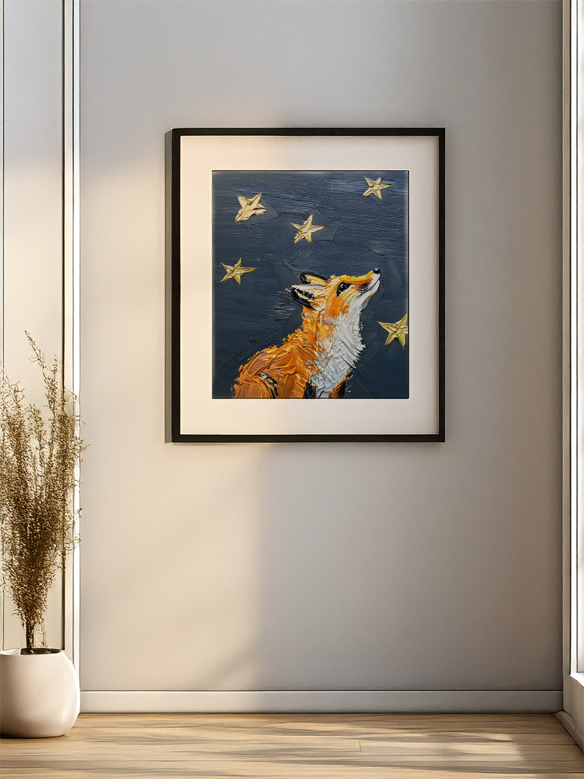 A beautiful, textured painting of a fox looking up at the night sky and the guiding light of the North Star.