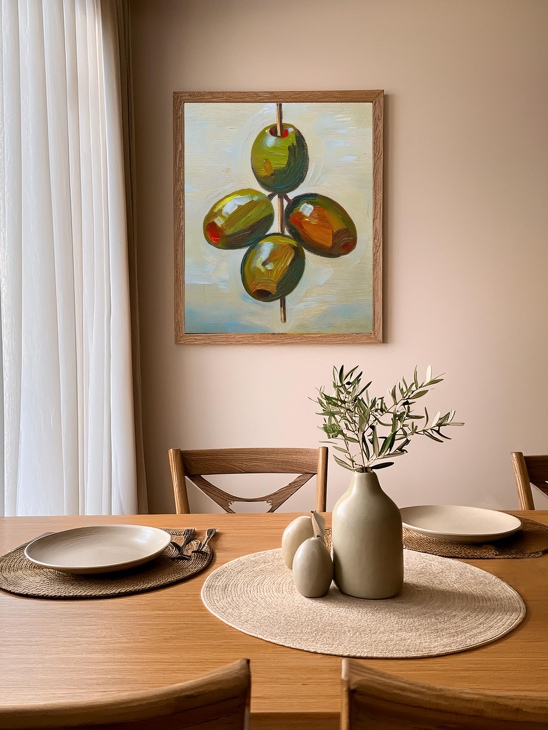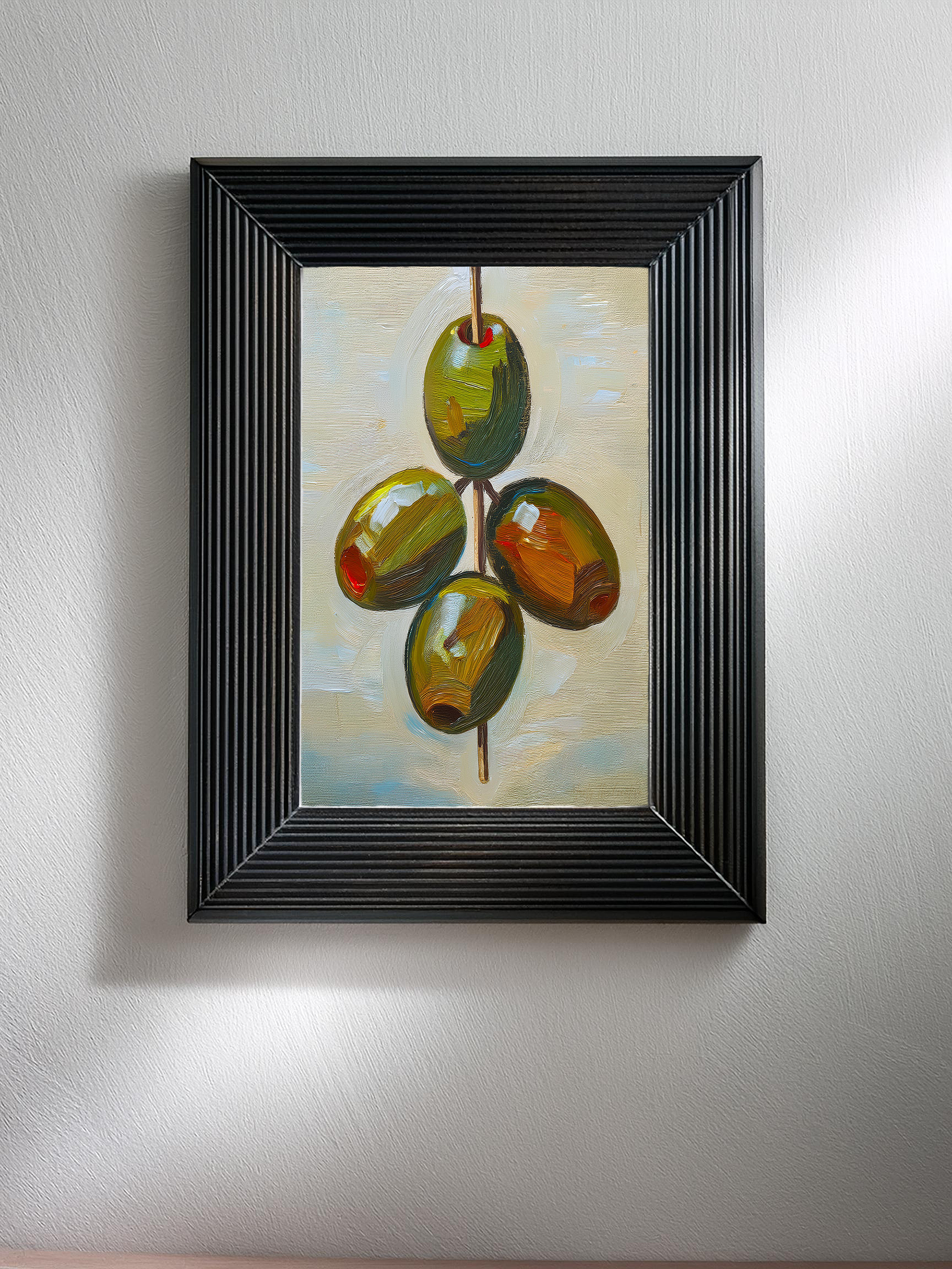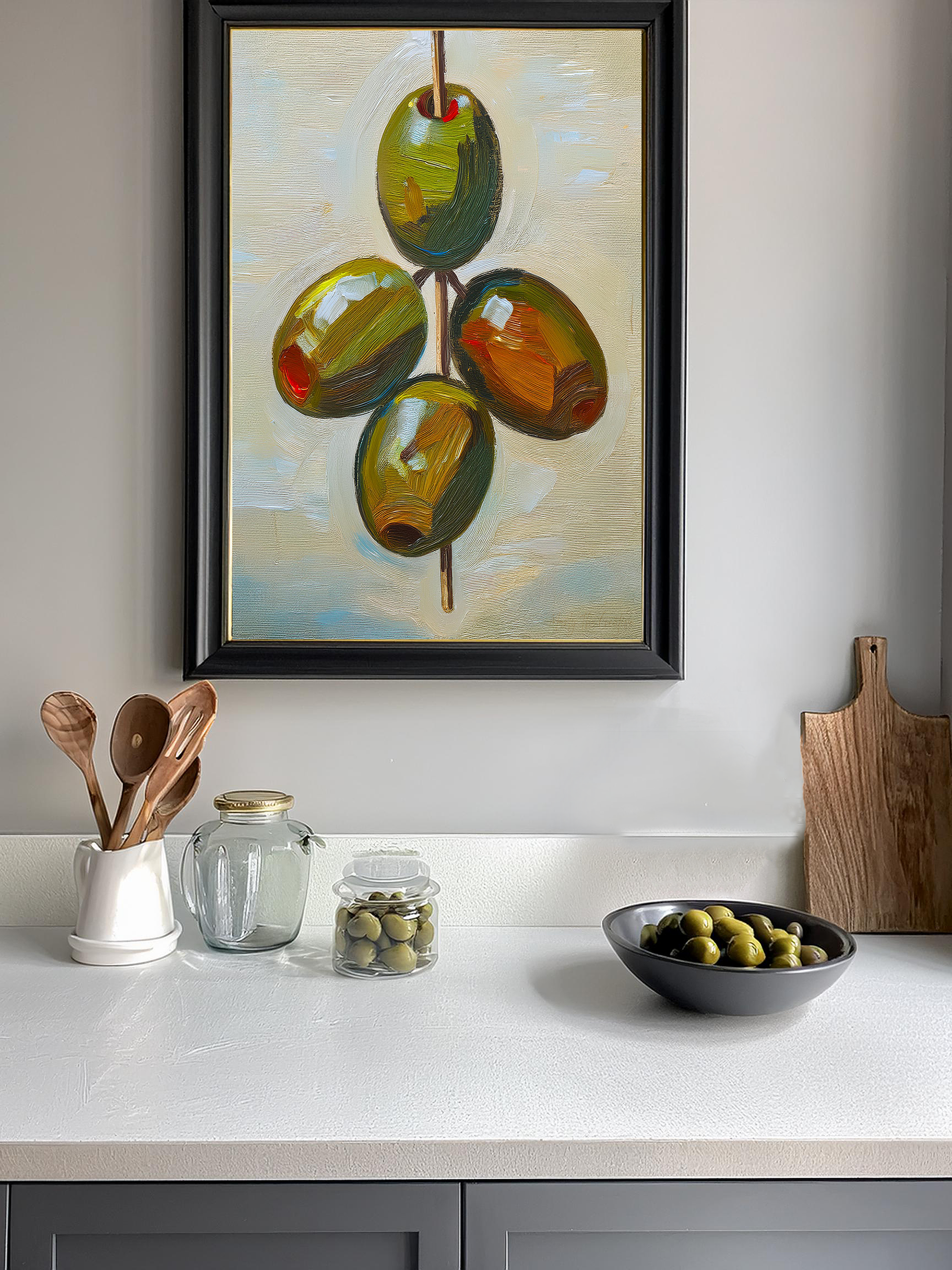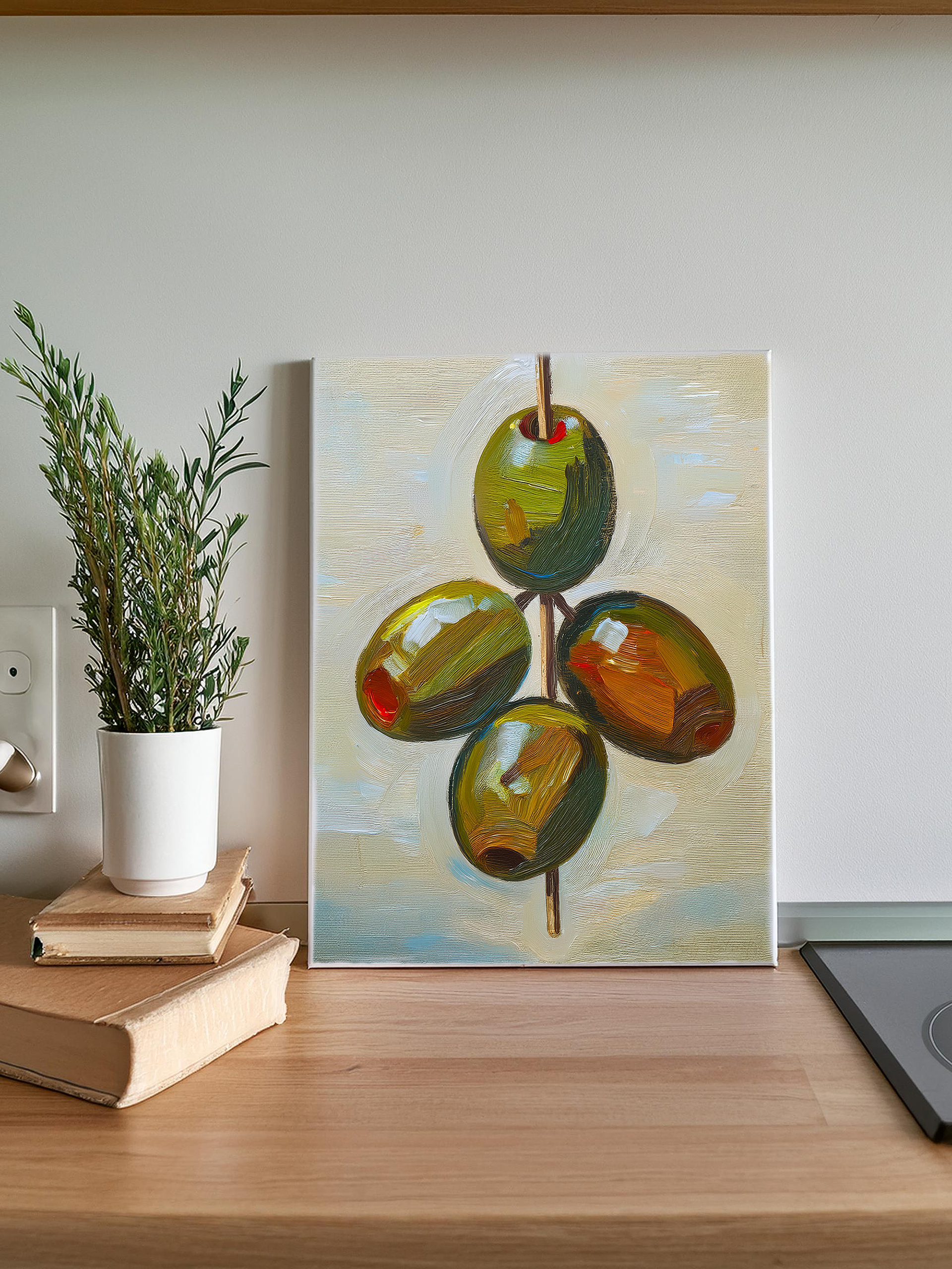 A fresh and vibrant painting of olives on a skewer, perfect for bringing a touch of Mediterranean charm to your home.