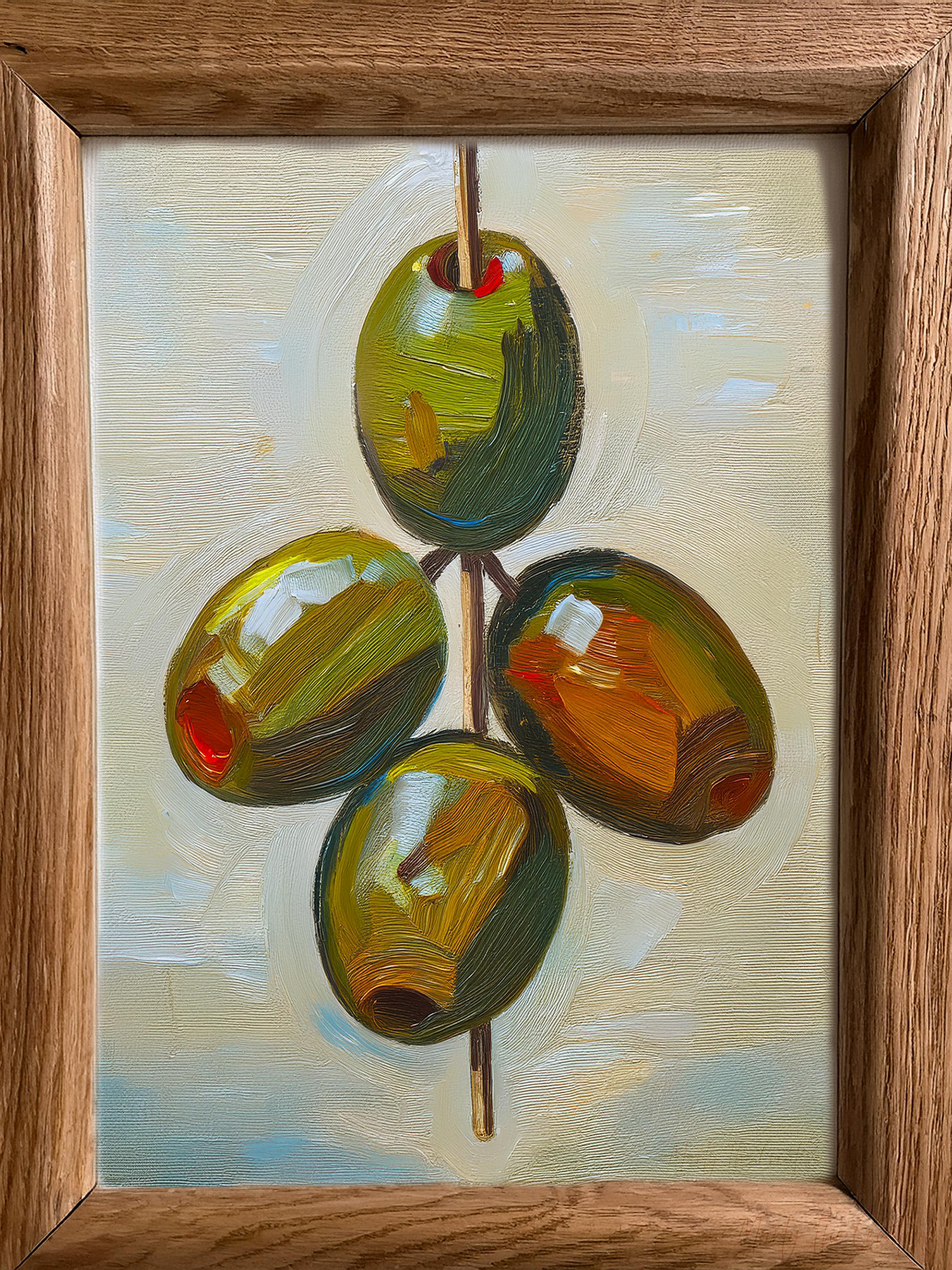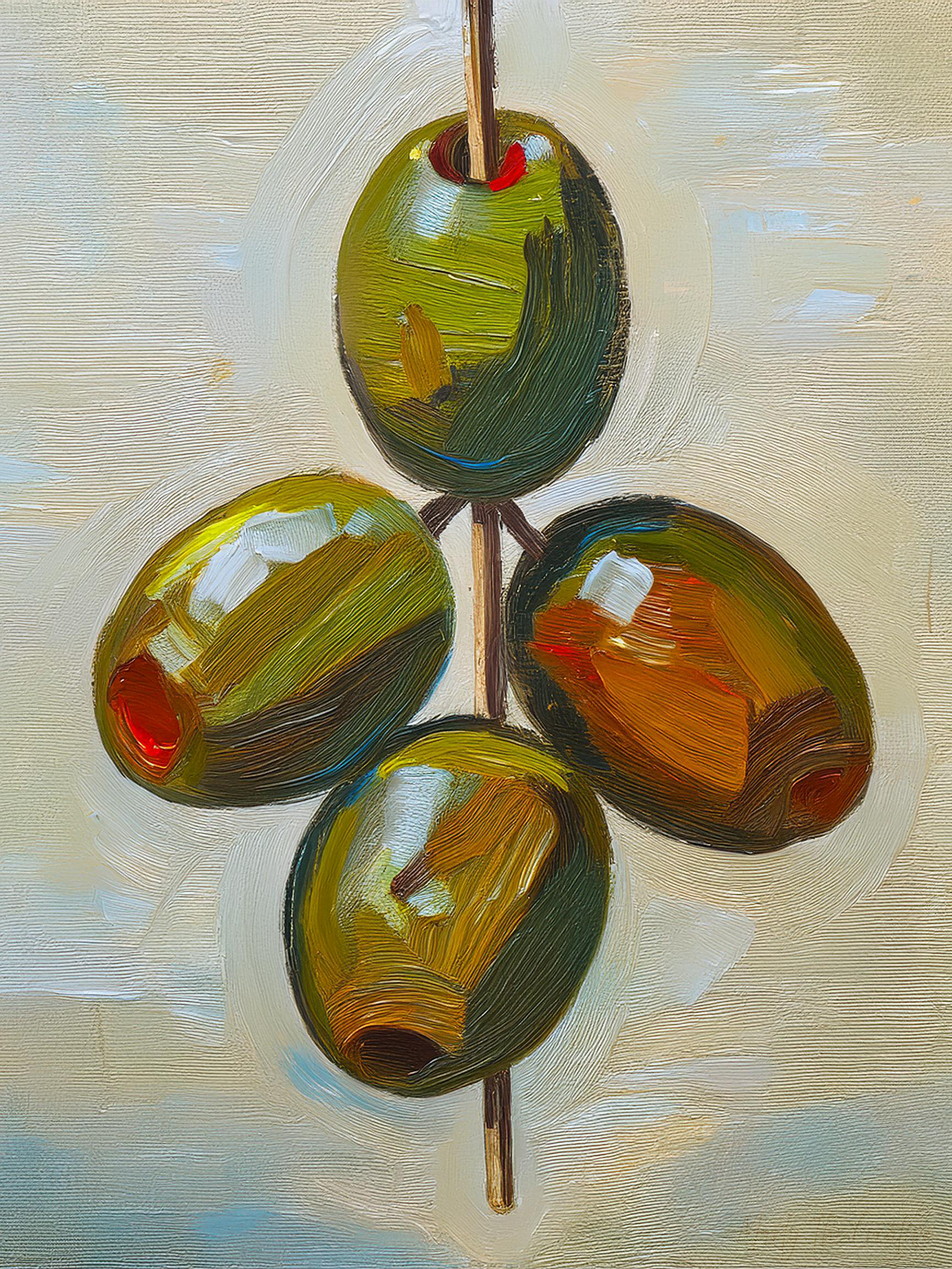 This painting brings a simple pleasure to life: fresh olives on a skewer. I wanted to capture the rich, glossy look of ripe olives, with their deep greens, hints of gold, and that pop of red pimento. It's a celebration of good food, good company, and the bright, warm feeling of a Mediterranean kitchen.